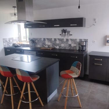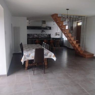 - Salon lumineux ouvert sur une cuisine équipée et aménagée
